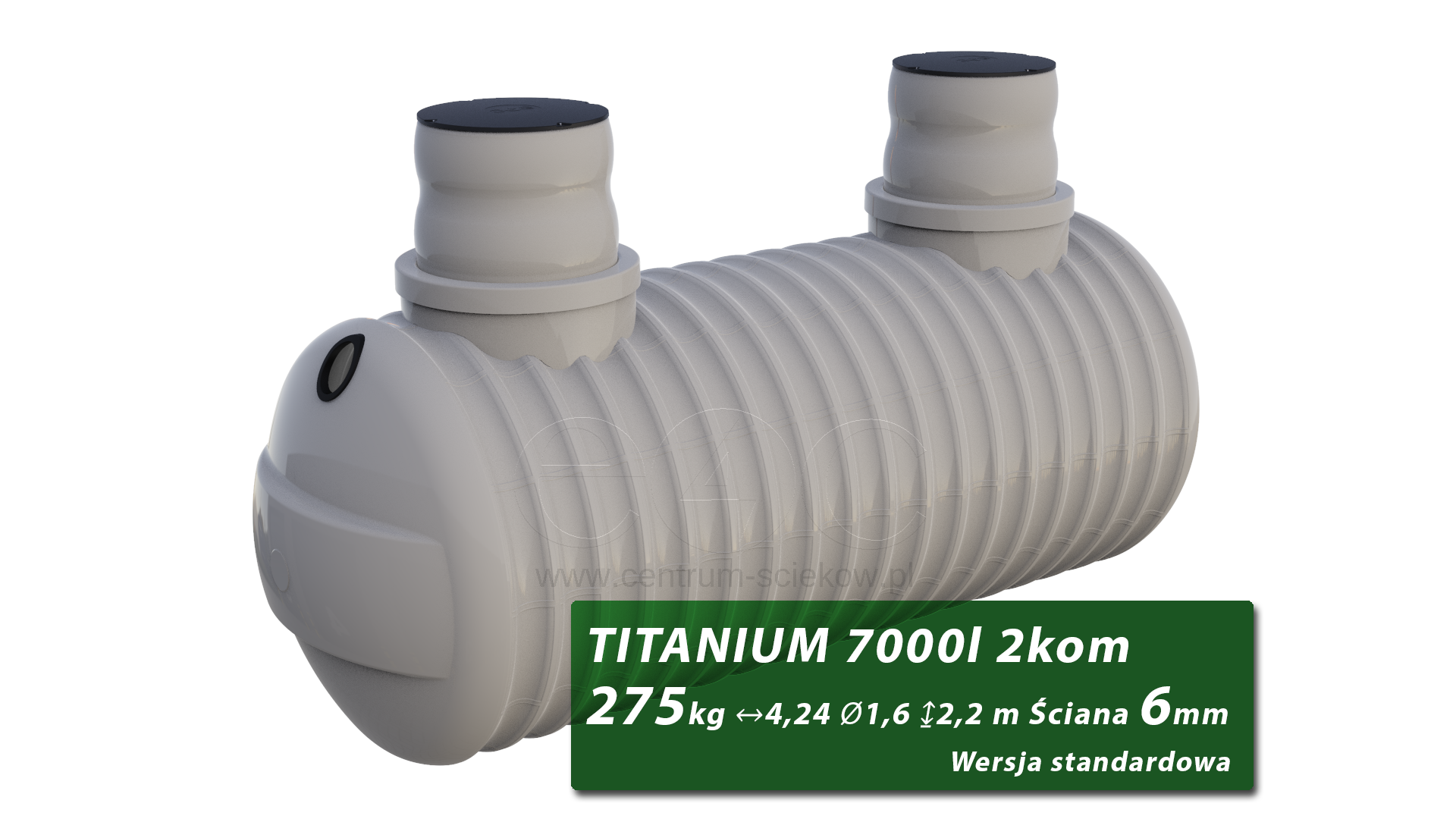Zbiornik dwukomorowy szczelny przeznaczony do gromadzenia ścieków w domach jednorodzinnych. Ze względu na średnia pojemność 7000L, jego głównymi odbiorcami są klienci chcący zainstalować szambo dla 3 osób. Zbiornik dwukomorowy na szambo składa się ze standardowego jednokomorowego zbiornika rozbudowanego o specjalną przegrodę montowaną zazwyczaj w połowie długości zbiornika dzielącą go na 2 części, posiada dwa kominy włazowe. W pierwszej komorze zbierają się tak zwany gęsty ściek a do komory drugiej grawitacyjnie przelewa się ściek o konsystencji rzadszej. Dzięki tak rozwiązanej konstrukcji można zastosować bakterie, które dozujemy do drugiej komory. Bakterie wspomagają rozkład nieczystości i przetwarzają je w wodę. Część zawartości szamba może być bezpiecznie odprowadzana poza zbiornik (do gruntu przy zastosowaniu systemu drenażu). We wnętrzu szamba pozostają tylko gęste zanieczyszczenia. Takie rozwiązanie ma dużą zaletę – zbiornik znacznie wolniej się zapełnia, co powoduje sporadyczne opróżnianie. Zbiornik wymaga tylko zgłoszenia, szamba do pojemności 10 m3 są na zgłoszenie powyżej tej pojemności trzeba wykonać projekt budowlany. Łatwość samodzielnego montażu to ogromna zaleta naszego zbiornika. Instalację można wykonać we własnym zakresie nie tracąc przy tym gwarancji, która może zostać przedłużona nawet do 15 lat. Na stronie w zakładce dokumentacja można znaleźć instrukcję montażu oraz całą niezbędną dokumentację.