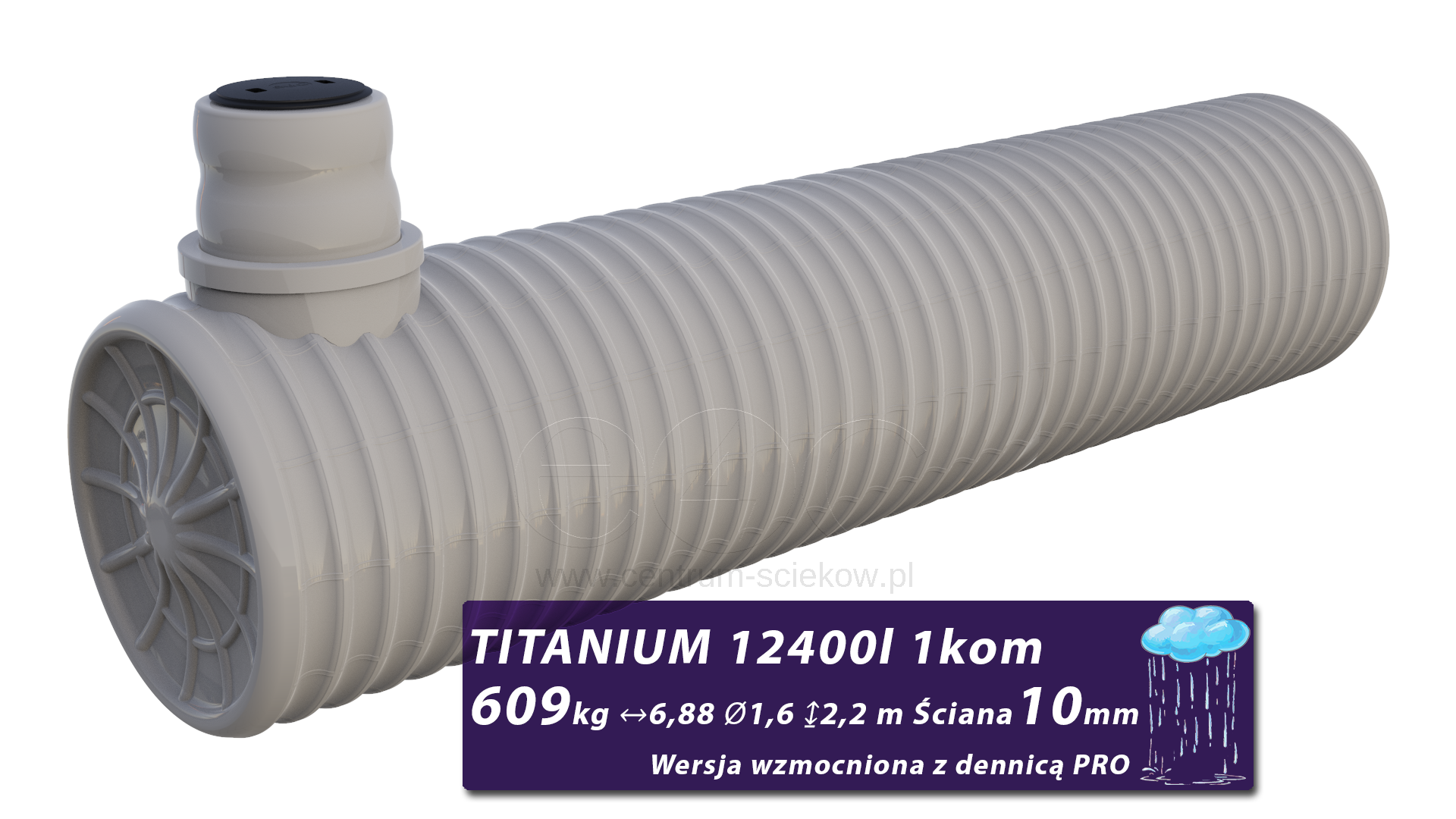 Wzmocniony zbiornik podziemny jednokomorowy z dennicą PRO o pojemności 12400l, przeznaczony do magazynowania wody deszczowej w budownictwie jednorodzinnym. Zbiornik jest odpowiedni do magazynowania deszczówki przy sporym ogrodzie.